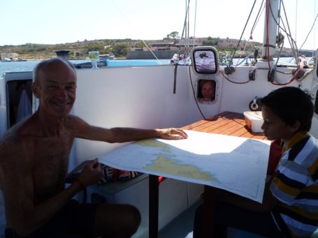 Sahil learning Map reading and sailing from David Millner
