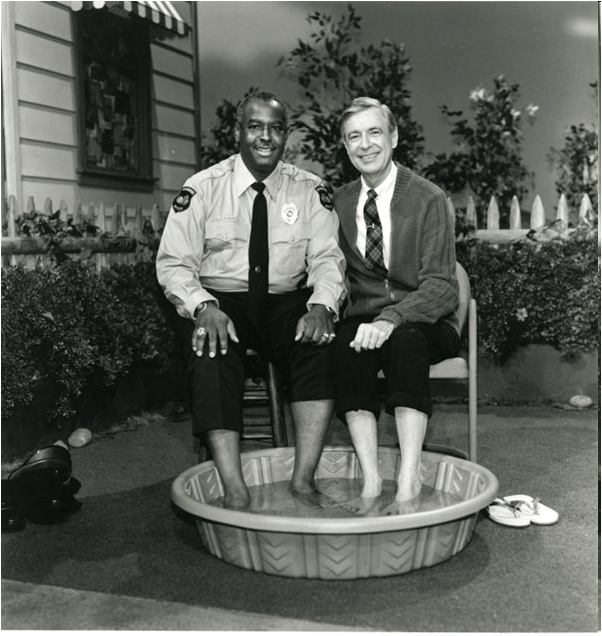 Rogers and François Clemmons reprising their famous foot bath in 1993. The 1969 scene was a message of inclusion during an era of racial segregation